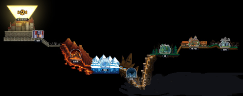 起点为最右侧,按从右至左顺序共有『墓地』『城堡外围城市』『森林』『洞窟』『雪原』『熔岩洞』『城门』『金字塔』共8处地点,主线剧情本会在活动前5天内分批开放。