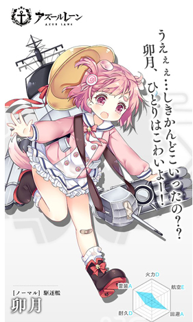 日服:根は真面目だが頭の回転が遅くよくドジをしてしまう。そそっかしいので色々と放っておけない。同型艦の睦月や如月とは仲良し。潜水艦が怖い。