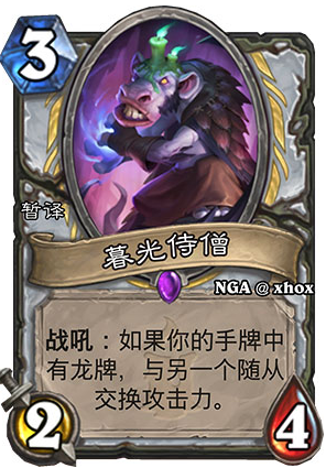 炉石传说狗头人与地下世界 牧师新卡——暮光侍僧(暂译),3费2-4,战吼:如果你手牌中有龙牌,与另一个随从交换攻击力。