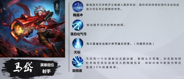 马岱后期:后期,马岱作为团队核心输出,敌人几乎很难逃脱的马岱的箭雨范围,利用团战的有力位置做疯狂输出,MVP似乎是马岱的常用标签。