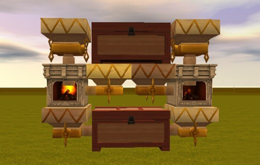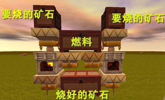 自动熔炼装置各部分的功能如上图所示,最上面2个箱子放要烧的矿石或者食物,中间2个箱子放燃料,最底下的箱子就是烧好的成品啦~