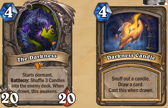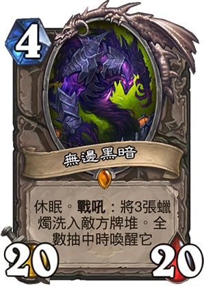 炉石传说狗头人与地下世界中立新卡,传说随从4费20-20,打入场时变成沉默状态(类似尸魔花第二形态)同时将三张蜡烛牌洗入你的对手的卡库,当你的对手抽到所有蜡烛牌时苏醒。