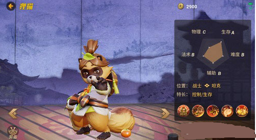 狸猫属于坦克型式神,前期可以出生存装备(血量、防御),中后期可以根据对方阵容,增加物抗或者魔抗。