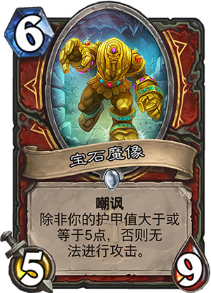 炉石传说狗头人与地下世界战士新卡——宝石魔像,6费5-9嘲讽,除非你的护甲值大于等于5,否则无法攻击。