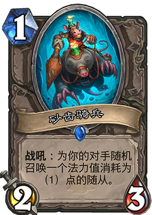 炉石传说狗头人与地下世界中立新卡——砂齿骑兵,1费2-3,战吼:给对手召唤一个1费随从。