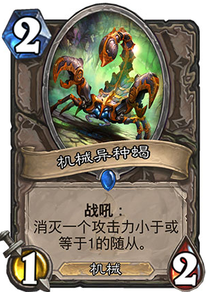 狗头人与地下世界中立新卡——机械异种蝎,2费1-2,机械,战吼:消灭一个攻击力小于或等于1的随从。