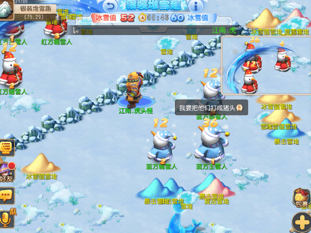 来自雪山深处的特殊雪堆,能够激发雪人隐藏的技能,打出惊世骇俗的雪炮。少侠进入银装堆雪趣的场景,寻找场景中的雪堆,送给己方雪人,即可打出雪炮,击毁对方雪人取得胜利。