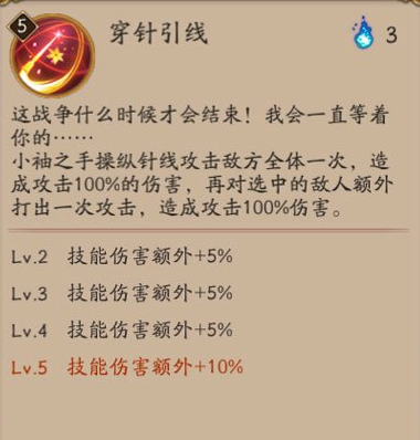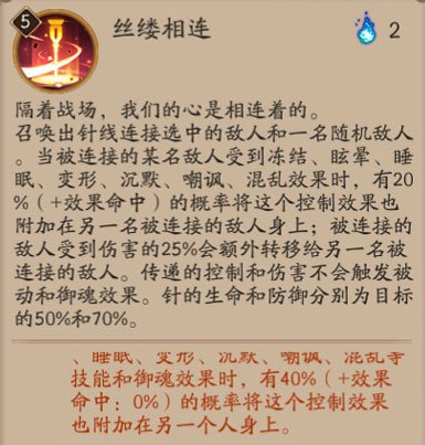2、丝路相连,召唤针线连接选中的敌人和一名随机敌人,这两个只要有个被控制,另外一个就有概率也受到相同控制效果。(满级40%,这里命中加成应该不止0%)