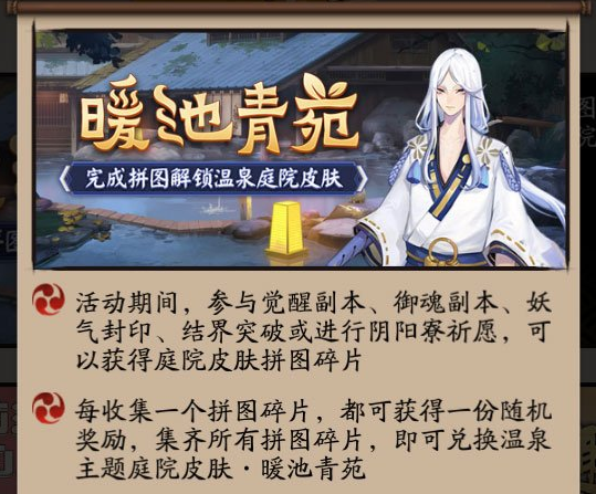 阴阳师庭院皮肤暖池青苑拼图活动开启,小伙伴们可以通过拼图获得庭院皮肤,因此不少小伙伴们想知道该怎么玩,因此想知道的就一起来看看吧。