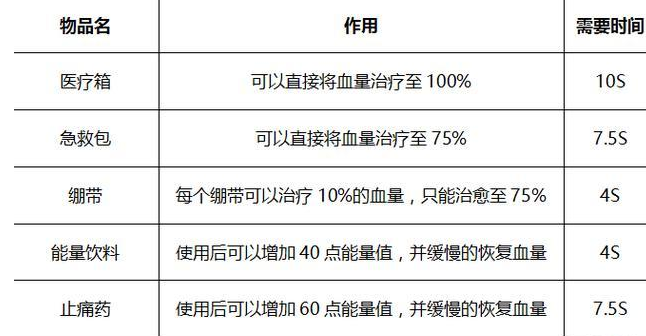 具体时间项数据无法确认,只是小编自己在游戏中的体验统计所得,下面给大家讲讲自己对药品使用的心得,我推荐在游戏开始时我们在背包中留15个绷带,其他的药品么你见到就捡吧,毕竟刷新率感觉不是特别高,还是要很珍惜的!