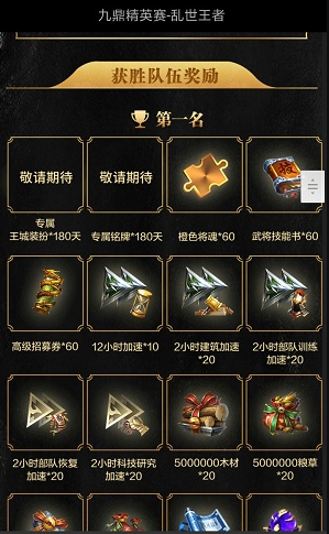 第一名:橙色将魂*60、专属王城装扮*180、专属铭牌*180天、武将技能书*60、高级招募卷*60、12小时加速*10、2小时建筑、部队、科技、治疗加速*20、木材1亿、粮草1亿、铁矿250万、宝石60万、高级兵书*20、高级技能丹*20。