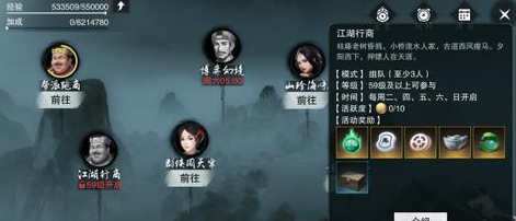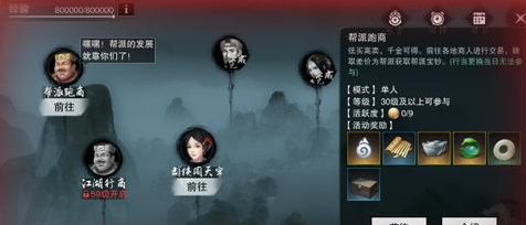 江湖行商玩法:行商作为队长组成至少三人的小队。从江南豪商邛库命处领取开始。玩家需要利用本金50000,前往江南、少林、华山、暗香、武当各处的商人处低买高卖赚至20000即可返回上缴领取奖励。一旦货车中额度超过200000就只能出售货物无法再行买入。沿途有概率遇到打劫的土匪和劫车的玩家,大侠小心了。玩法开启当日玩家前两次可直接获得行商奖励,两次以后只能获得分成额度的商票,商票可上缴至帮派增加帮派资金获取帮贡。