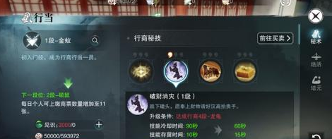 破财消灾:跪下磕头,愿奉上财物请好汉高抬贵手,这个技能可在江湖行商中遇到打劫时使用;技能等级提升可以增加延续时间和缩短冷却。