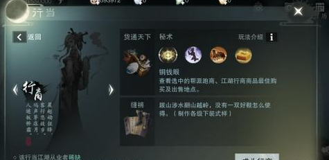 铜钱眼:查看选中行商、跑商商品最佳购买及出售地点(可在对应道具详情中使用);技能等级提升可以增加同时查看商品个数。