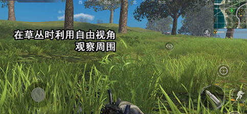 一些玩家在草丛趴下后,喜欢不停的转来转去试图寻找敌人,寻找敌人是没有问题的,但如果是通过转动角色来进行观察,那么非常容易被人发现,尤其在稍远距离处在高点位置的玩家很容易发现你的存在。如果大家在趴下后想进行观察,一定要利用自由视角,而不是转动角色。