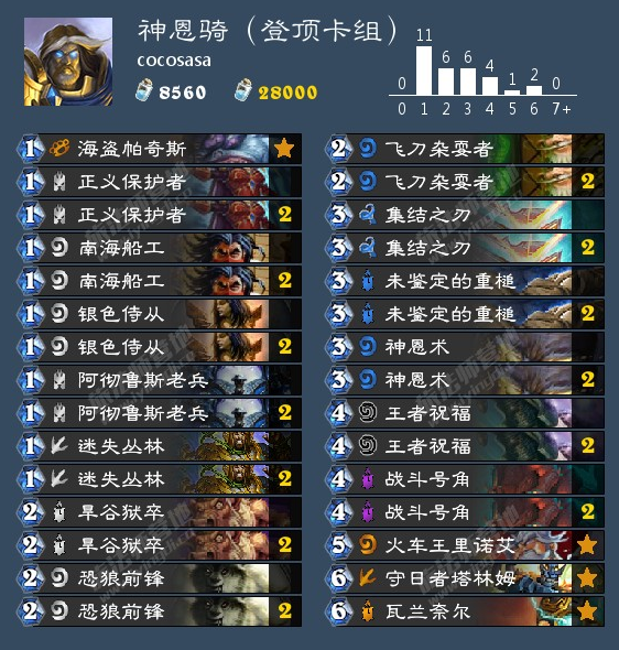 狗头人与地下世界新版圣骑士卡组构筑,一套带了橙武瓦兰奈尔的神恩骑。依靠大量低费随从配合BUFF来站场打脸,是一套简单粗暴的卡组,大神cocosasa也依靠这套卡组成功登顶天梯。