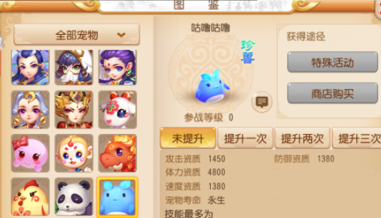 从上图来看,咕噜咕噜跟神兽一样可以提升三次,必带技能,咕噜咕噜:被法术攻击时有几率不受伤害,被物理攻击时受到伤害增加,此特性对玩家角色无效。默认技能:高级神佑复生,高级敏捷,高级幸运,高级感知。