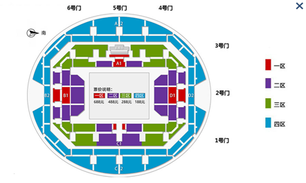 场馆座位分为一区和二区,以及三区和四区,一区的价格是688元人民币,二区价格是488元人民币,三区价格是288元人民币,四区价格是188元人民币。一区的价格最贵但也是离比赛主场最接近的位置,以下是作为分布图: