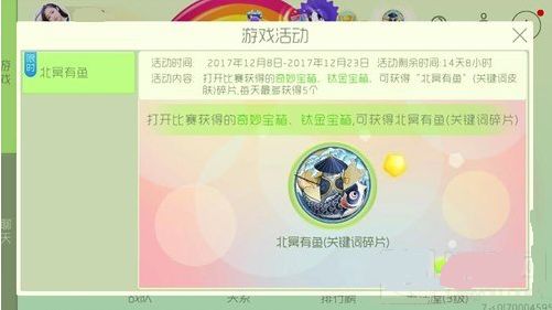 在2017年12月8日~2017年12月23日参与比赛,获得奇妙宝箱和钛金宝箱,打开之后,可获得北冥有鱼关键词皮肤碎片,每天最多可获得5个。