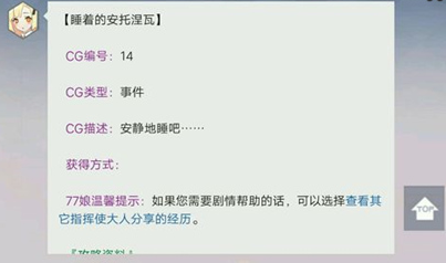 目前在77百科中可以搜到这个CG的相关内容,但具体的解锁方式是没有放出,小编猜测官方可能还没有完善这条线,因为目前的情况来看,似乎很多玩家都没有解锁这个事件。