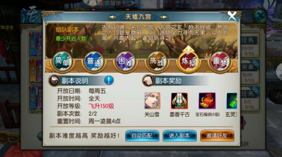 副本天墟宫为5人组队副本,每周五全天开放,分为六个难度,参考镇魔玄冥!