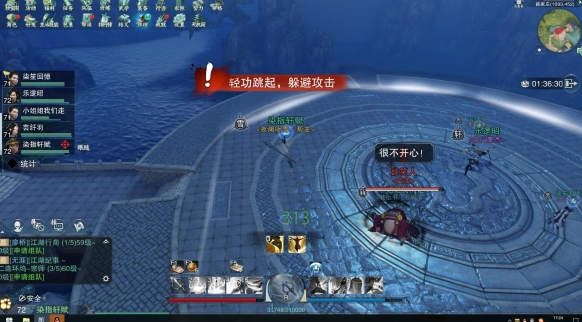 薛宝宝在阔剑时造成伤害还会造成流血效果,当薛宝宝快速滚向仇恨最高目标时,他会蓄力2秒同时喊“死到临头,会有人分摊你的痛苦么?”之后,会高高跳起并对大范围区域造成巨量AOE伤害,这个时候应尽量靠拢,分摊伤害。在他生气剁脚时候,会定身所有玩家并一屁股坐在地上造成大量伤害,这个时候交解控技能并用轻