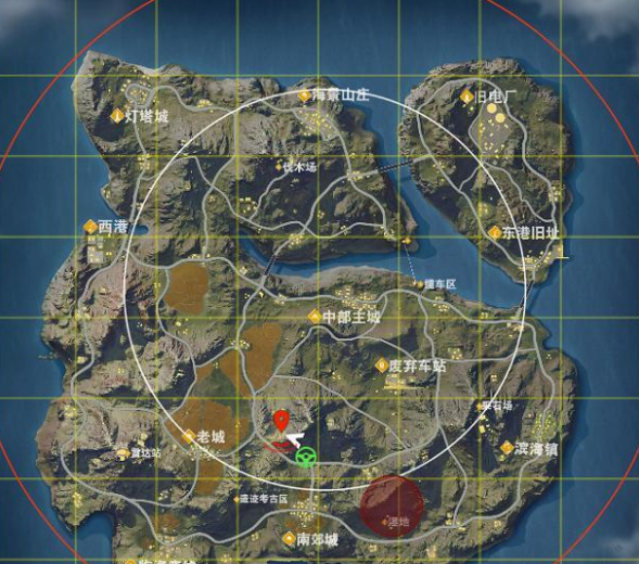 在地图中心偏下一点的位置,旁边靠近老城、南郊城、麦田。很大机率在信号区内,所以很有充足的时间搜索物资。