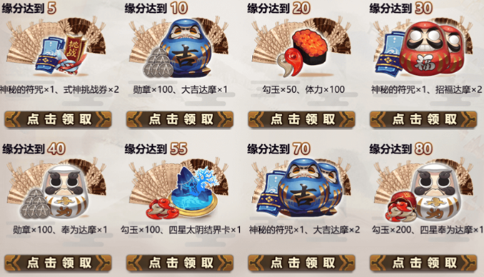 使用结缘币向稻荷神祈愿,可获一份随机奖励,每次祈愿还可增加一点缘分值,缘分值达到指定数值可获额外奖励。