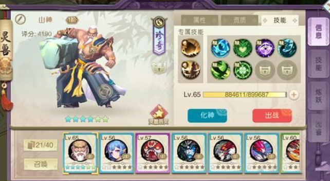 山神是属于“不死”类型的“珍奇”品质灵兽,它的初始技能为“泰山压顶”与“不识庐山”,其中泰山压顶作为天赋主动技能,可以对敌方单体造成物理伤害,有一定几率为自己增加20%防御,持续2回合。而不识庐山作为另外一个天赋主动技能,可以嘲讽敌方单体,使其只能对自己使用普通攻击技能,持续2回合。山神作为珍奇品质的灵兽,初始的速度资质高达A品阶,可以说是十分的优秀,高额的速度资质在出手速度上得到迅速的提升,从而提高山神在战斗中的出手顺序,同时,因为山神的防御资质处于B品阶的中等水平,所以其在战斗中的生存能力不用大人特别担心,并且,山神可以通过技能增加我方队伍的防御能力,从而增大我方队伍的生存几率。另外,作为珍奇品阶的灵兽,山神有着不错的培养价值,所以大人们如果获得了山神,可不要错过培养它哦!