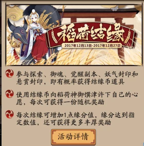 阴阳师稻荷结缘活动怎么玩?阴阳师稻荷结缘活动上线,刷图随机掉落结缘币,使用结缘币后恩能免费领取勾玉、金币、符咒 ,更有机会能获取新SSR御馔津,接下来就跟西西一起看看稻荷结缘活动玩法攻略吧!