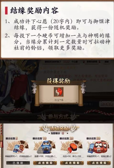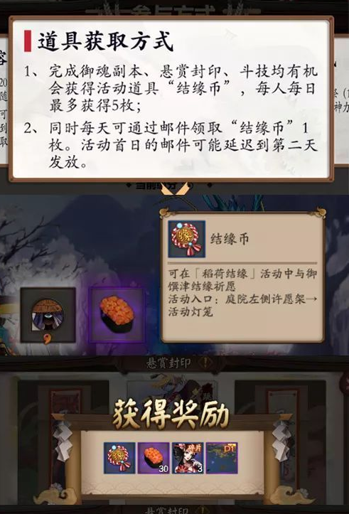 活动使用的道具是结缘币,刷图,刷御魂,做悬赏都能拿到结缘币。