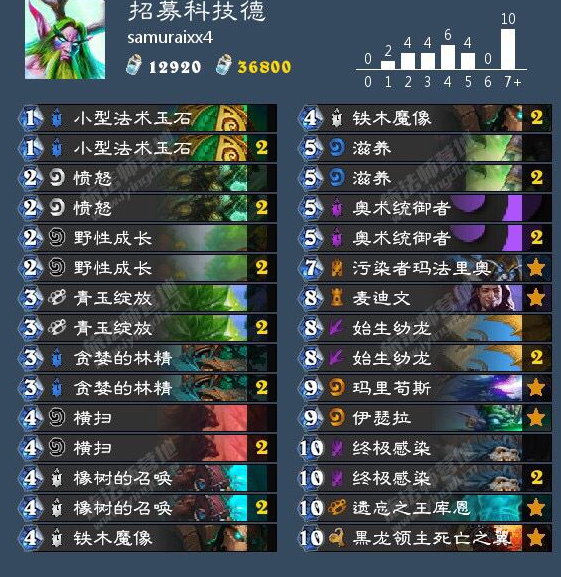 上午开完卡包开始打,从13级一路到低保,感觉强度很高。优势在于橡树的召唤这张牌,加甲顺便升级玉石,过牌,入场不是嘲讽就是亡语加水晶,一举多得。