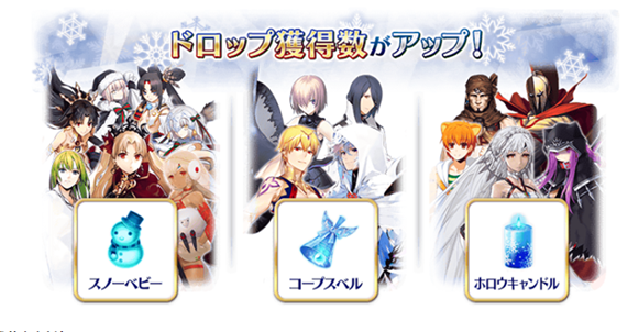 装备池内的期间限定概念礼装,可以让活动道具「雪人宝宝」「死者之铃」「空心蜡烛」的掉落数增加。