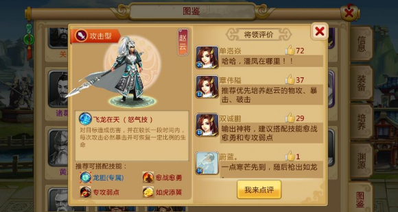 游戏首充送的一个武将,可以用到很久了。赵云的特色就是可以回血,可以在对战中消耗对方。平时堆个暴击,他的伤害还是很不错滴。还不容易死,这个首冲我非常,非常建议你们买一个,很超值的。