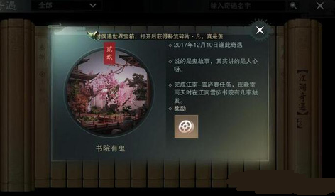 任务概述:讲的是鬼故事,其实讲的是人心啊,需要玩家完成江南——雪庐春任务后在雷雨天前往书院触发,自动寻路即可完成。