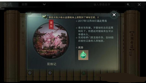 以上就是楚留香手游双姝记奇遇的相关攻略介绍,如果小伙伴们是玩暗香的,可以等级到达要求后就可以让接取任务获取奖励了。