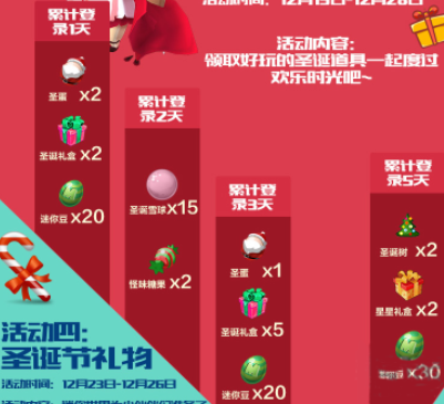 累计登录5天:圣诞树*2、星星礼盒*2、迷你豆*30