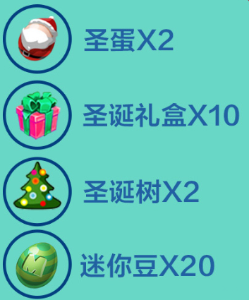 累计登录1天:圣蛋*2、圣诞礼盒*2、迷你豆*20