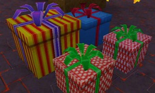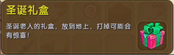 圣诞老人的礼盒,放到地上,打掉会获得奖励(圣诞树、棒棒糖斧、拐杖糖镐、圣诞小雪球等圣诞礼物)