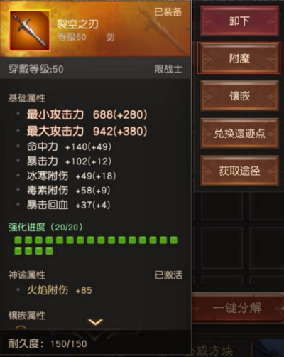 游戏中,50级以上史诗和传说品质的装备,可以进行附魔,以额外提升装备的属性。点击主界面的工坊按钮,或者直接点击装备、选择附魔,来进入装备附魔界面。