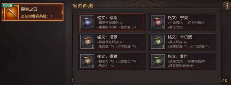 当选择了一个铭文之后,我们可以在附魔界面看到属性的数值范围,如下图。