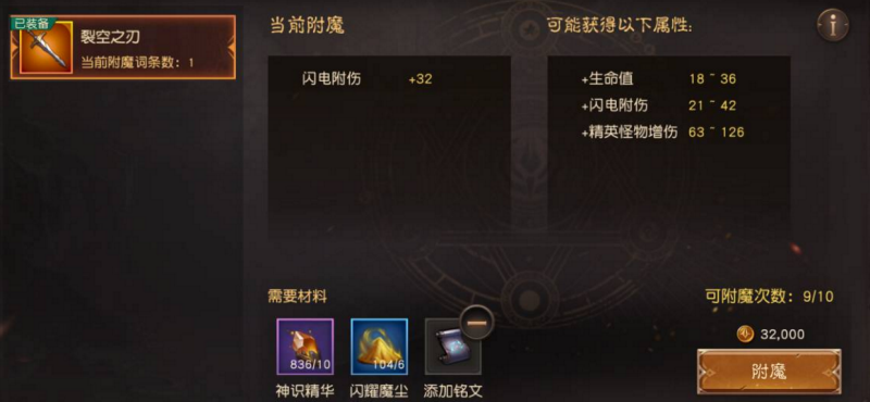 对于史诗装备,附魔可以附加1个额外词条,传说装备则可以附加1~2个额外词条,数量随机。附魔需要消耗三种材料:装备精华、闪耀魔尘、铭文。装备精华和闪耀魔尘会自动投入,铭文则特殊一些,需要玩家自行选择加入,因为每种铭文的效果都是不同的。