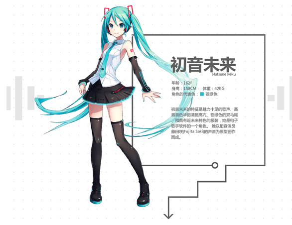初音未来,自然就是《初音速》的女主角了,双马尾,公式服,元气满满就是她的人设啦!本职工作是一名虚拟偶像,现在正以全宇宙最强偶像为目标努力募集粉丝中。永远的16岁少女,最擅长的音乐是华丽清脆的高音音色,名字中“未来”两字也许代表着未来音乐无限的可能性哦!