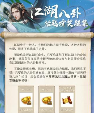 江湖八卦征集每个月比较活跃的前三名少侠专属称号,如果达不到前三没有关系,我们还有设置入选优胜奖(绑元*50),连续人气作品奖(绑元*888)哦。