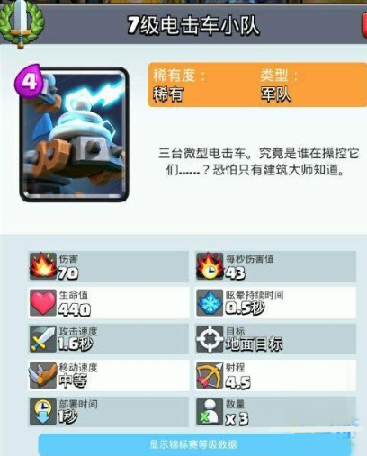 电击车小队是我们在11阶(电磁峡谷)竞技场中解锁的,攻击目标为地面,4点圣水,属于一个中低费卡牌。这张卡牌在对战中多是用于辅助和控制为主,其用法很多时候和闪电法师有些类似。