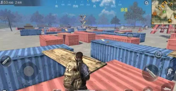 物资道具都分布在集装箱顶部,需要从斜板爬上去才能捡得到,在不确定附近是否有人的情况下,建议捡到枪就跳下来。毕竟当你站集装箱上时,对手即便是个小聋瞎也能轻易发现你。