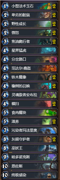 卡组核心思路:前期嘲讽消耗+跳费,中期灰熊守护者巫妖王苟活返场,后期出哈多诺克斯,食肉魔块吃哈多诺克斯,复活出灰熊守护者等嘲讽怪,恩佐斯复活哈多诺克斯,灰熊守护者等亡语怪,对手资源耗尽GG。