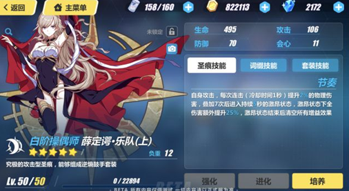 回音:自身攻击,每次连击(冷却时间1秒)提升2%的攻击速度,叠加7次后进入持续5秒的激昂状态,激昂状态每次连击(冷却时间0.9秒)额外获得2点SP,激昂状态结束后清空所有增益效果