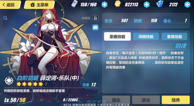 韵律:自身攻击,每次连击(冷却时间1秒)提升2%的暴击率,叠加7次后进入持续5秒的激昂状态,激昂状态下不会被控住,受到的全伤害降低15%,激昂状态结束后清空所有增益效果。