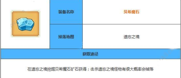 在遗忘之境挖掘贝希魔石矿石获得;击杀遗忘之境怪物有很大概率会掉落